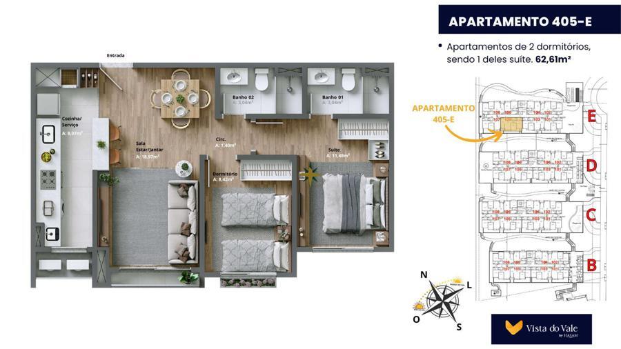 Apartamento de 2 dormitórios, sendo 1 deles suíte (62,93m², 65m², 65,47m²);