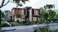 - Casa estilo contemporâneo misturando concreto aparente com revestimento em pedra natural e madeira